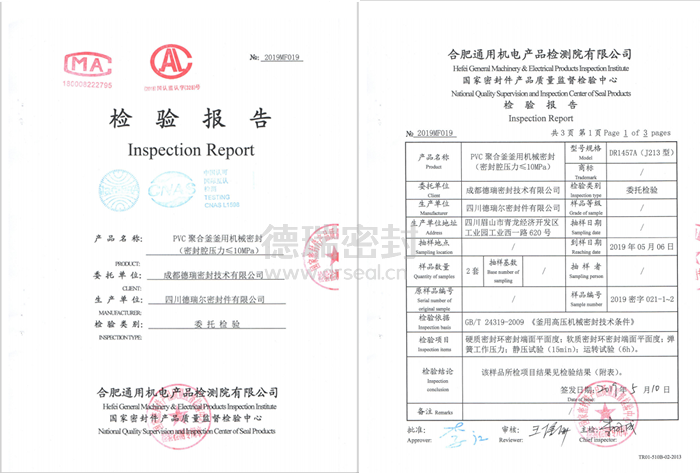 PVC聚合釜釜用機(jī)械密封檢驗報告